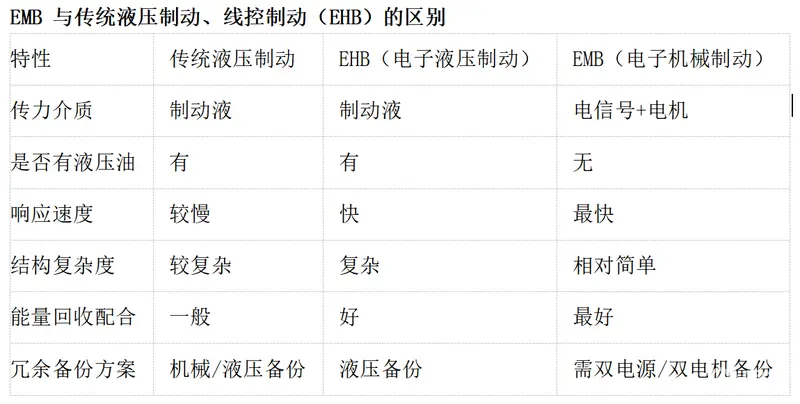 简略了解:传统刹车靠“踩刹车踏板→液压油传力→刹车片夹紧刹车盘”;而 EMB 靠“踩刹车踏板→电信号→电机推进→刹车片夹紧刹车盘”。